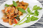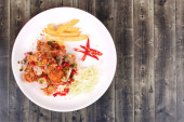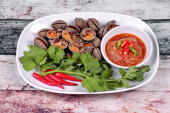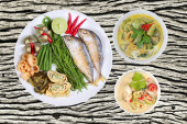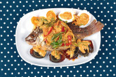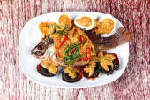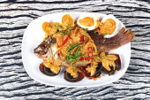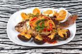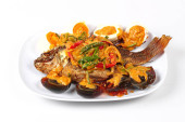 Ryby smażone curry tilapia z zachowanych jajko i solone jaja.