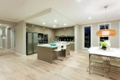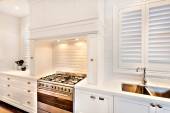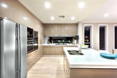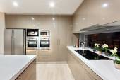 Nowoczesna kuchnia z lodówką i przymocowana do ściany za pomocą cabi