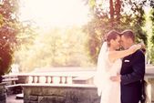 Para ślub tło zabytkowy kościół z wysokiej kolumny .