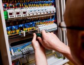 badania maszyn przemysłowych, elektryk budowniczy inżynier wkręcania sprzęt Skrzynka bezpieczników, mężczyzna elektryk elektryk