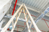 Zdjęcie "System zraszaczy ogień z rury czerwony jest umieszczony do zwisające z t" może być wykorzystywane do celów osobistych i komercyjnych zgodnie z warunkami zakupionej licencji Royalty-free. Obraz jest dostępny do pobrania w jakości wysokiej rozdzielczości do 5760x3840.