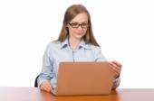 Kobieta kobieta interesu, praca przy biurku na białym tle