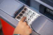 Zbliżenie dłoni wprowadzania kodu pin palcem Atm. około wcisnąć