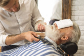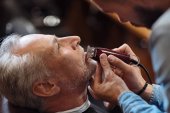 Młody przystojny Fryzjer cięcia wąsy starszego klienta z nożyczkami