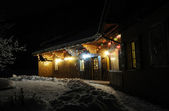 Piękny skandynawskich Fiński Szwedzki norweski drewniany domek domku w pobliżu stoków narciarskich w ośrodku narciarskim w porze nocnej