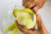 Peeling skóry off za pomocą noża paring zielonego jabłka