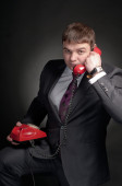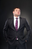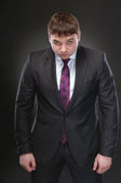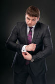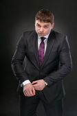 młody człowiek w garniturze koryguje spinki do mankietów
