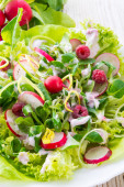 Zielona sałatka ze szpinaku, frisee, Rukola, radicchio i granatu nasion na niebieskim tle drewnianych