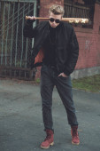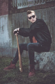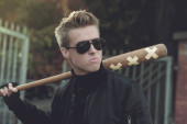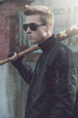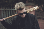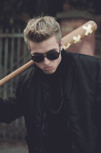 Młody przystojny blond włosach hooligan portret z kijem