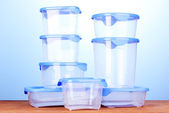 plastikowe pojemniki do żywności na drewnianym stole na zielonym tle