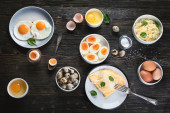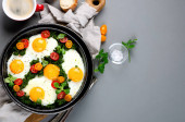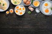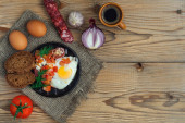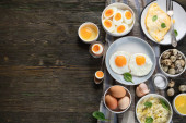 Jajka sadzone na rustykalne drewniany stół dla zdrowe śniadanie.