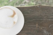 Bliska białe filiżanki kawy latte na drewnianym stole