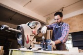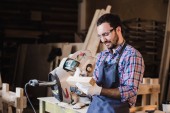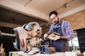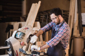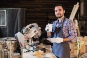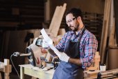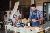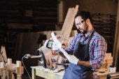 zawód, Stolarstwo, Stolarka koncepcja ludzie - cieśla z deski i notebook sprawdzanie jego uwagi o warsztatów