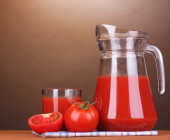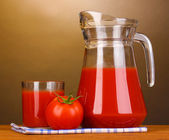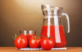 sok pomidorowy w dzban i szkło na drewnianym stole na brązowym tle