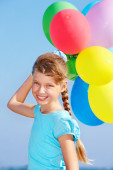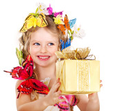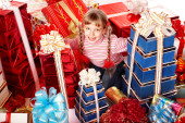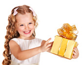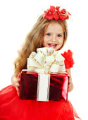 dziecko dziewczynka w czerwonej sukience z pudełko.