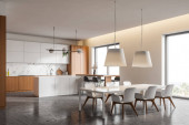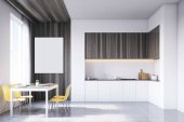 Zdjęcie "Kuchnia z meblami z ciemnego drewna i plakat" może być wykorzystywane do celów osobistych i komercyjnych zgodnie z warunkami zakupionej licencji Royalty-free. Obraz jest dostępny do pobrania w jakości wysokiej rozdzielczości do 5760x3840.