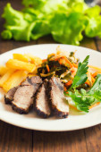 W plasterkach wołowiny wyprażać na toast, sera, bazylia, jagody, śliwki i Sos holenderski. Restauracja dostaw drewniane tła. Widok z góry. Szczelnie-do góry