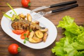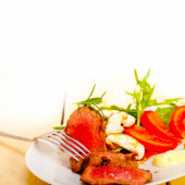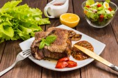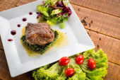 W plasterkach wołowiny wyprażać na toast, sera, bazylia, jagody, śliwki i Sos holenderski. Restauracja dostaw drewniane tła. Widok z góry. Szczelnie-do góry