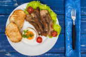 W plasterkach wołowiny wyprażać na toast, sera, bazylia, jagody, śliwki i Sos holenderski. Restauracja dostaw drewniane tła. Widok z góry. Szczelnie-do góry