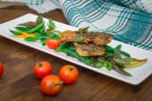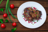 Półmisek mięs pieczonych na grillu z sosem berry i rukolą w restauracji. Drewniane tle rustykalnym. Widok z góry. Szczelnie-do góry