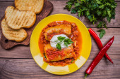 Zdjęcie "Kolacja z Gołąbki w sosie pomidorowym urządzone pietruszka. Drewniane niebieskie tło w stylu rustykalnym. Widok z góry. Szczelnie-do góry" może być wykorzystywane do celów osobistych i komercyjnych zgodnie z warunkami zakupionej licencji Royalty-free. Obraz jest dostępny do pobrania w jakości wysokiej rozdzielczości do 5760x3840.