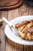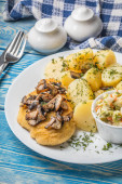 Chrupiące ziemniaczane domowe placki z sosem grzybowym.
