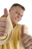 uśmiechnięty młody człowiek pokazujący kciuki do góry