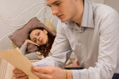 Młody człowiek przyniósł kawy do swojej dziewczyny, a ona siedzi na