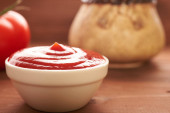 Ketchup i pomidorów na drewnianym stole