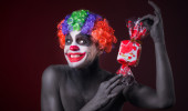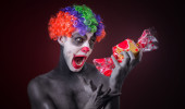 przerażający Klaun z upiorny makijaż i więcej cukierków
