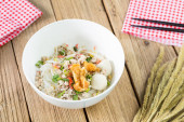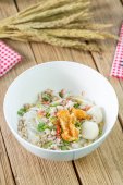 Makaron ryżowy cienkie z plasterki wieprzowiny w bulionie, Thai noodle