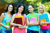 piękne kobiece studentów na zewnątrz z grupą na tle