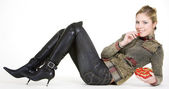 kobieta nosi czarne ubrania i buty, siedząc na kanapie