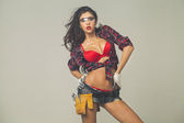 Piękny hot blond kobieta trzymać piłą łańcuchową