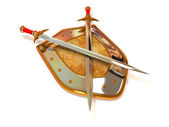 średniowieczny rycerz miecz i hełm 3d ilustracja na białym tle