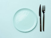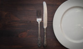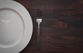 Połowa puste talerze białe, vintage noża i widelca na stole