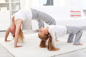 zdrowego stylu życia - kobieta i dziewczynka robi ćwiczenia gimnastyczne