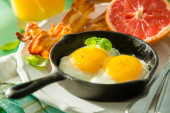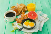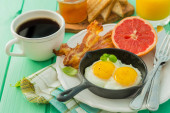 Latem śniadanie - jajka, bekon, tosty, dżem, Kawa, sok