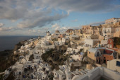 Białe miasta na stoku wzgórza o zachodzie słońca, Oia Santorini, spędzeniu