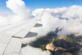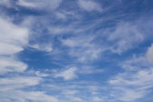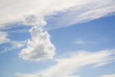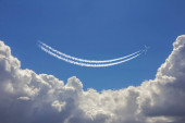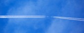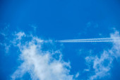 samolot flys w białe chmury w błękitne niebo i pozostawiając ślad