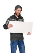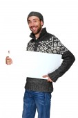 Uśmiechnięty mężczyzna dostawy przytrzymanie Schowka na białym tle