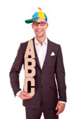 Uśmiechnięty mężczyzna dostawy przytrzymanie Schowka na białym tle