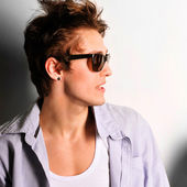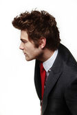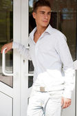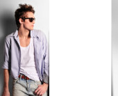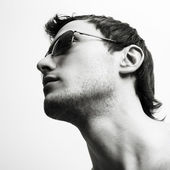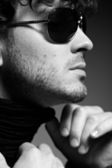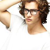zbliżenie młody, przystojny mężczyzna w okularach myślenia