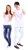 Wyświetlone para nastolatków miłość kciuki do aparatu
