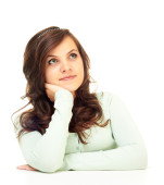 atrakcyjny dziewczynka uśmiechający się w niebieską koszulę, siedząc w karcie
