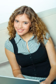 atrakcyjny dziewczynka uśmiechający się w czerwonej koszuli siedzi w tabl