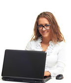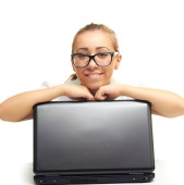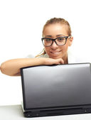 atrakcyjny dziewczynka uśmiechający się w czerwonej koszuli siedzi w tabl
