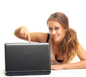 atrakcyjny dziewczynka w czerwonej koszuli, pracuje na laptopie i drinkin