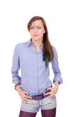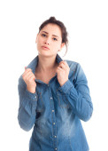 Ładna dziewczyna w jeans koszula pozowanie na białym tle