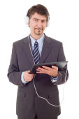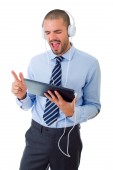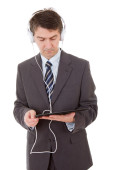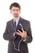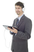 biznesmen z komputera typu tablet i słuchawki, na białym tle